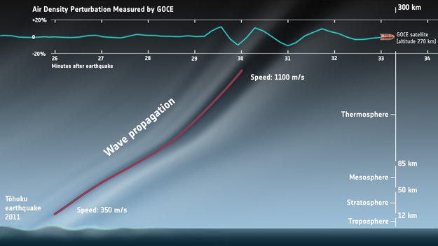 Γάλλοι και Ολλανδοί επιστήμονες, με επικεφαλής τον γεωφυσικό Ραφαέλ Γκαρσία του πανεπιστημίου της Τουλούζης, που έκαναν τη σχετική δημοσίευση στο περιοδικό γεωφυσικής «Geophysical Research Letters», αναφέρουν ότι ο σεισμός του 2011 στην Ιαπωνία ήταν τόσο δυνατός, που έγινε αντιληπτός και από το διάστημα. Τα ηχητικά κύματα από το σεισμό έγιναν καταγράφηκαν σε ύψος 260 χιλιομέτρων από το δορυφόρο GOCE του Ευρωπαϊκού Οργανισμού Διαστήματος, που χαρτογραφεί τις αδιόρατες μεταβολές στη βαρύτητα του πλανήτη μας.