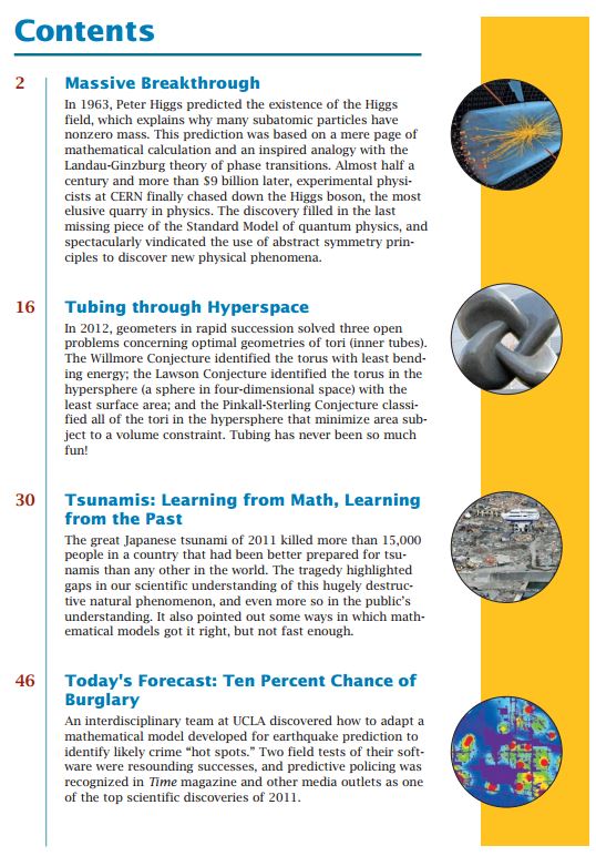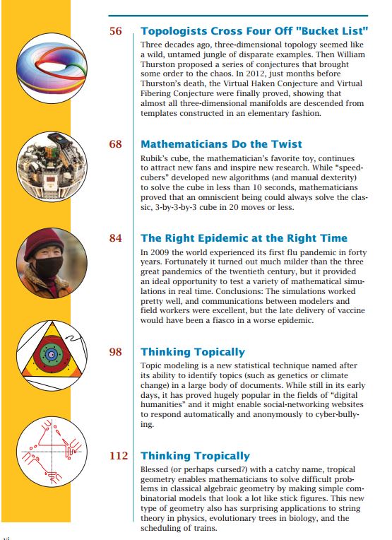 Το ενδιαφέρον της έκδοσης είναι ότι ένα μέρος της, συνδέει αρκετές εξελίξεις στον κόσμο των μαθηματικών με την καθημερινότητα, συχνά με συναρπαστικές ιστορίες. Κάποιες από αυτές βρέθηκαν και στα πρωτοσέλιδα ορισμένων εφημερίδων.