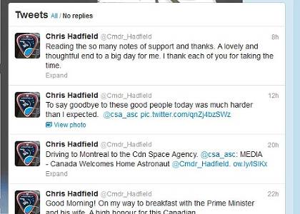 Συγκεκριμένα, ο Hadfield δημοσίευσε τη Δευτέρα στο Twitter μία φωτογραφία από το Διαστημικό Κέντρο του Καναδά (CSA) με τους συναδέλφους του να τον αποχαιρετούν και τη λεζάντα «ήταν πολύ πιο δύσκολο απ’ ότι περίμενα να πω σήμερα αντίο σε αυτούς τους καλούς ανθρώπους».