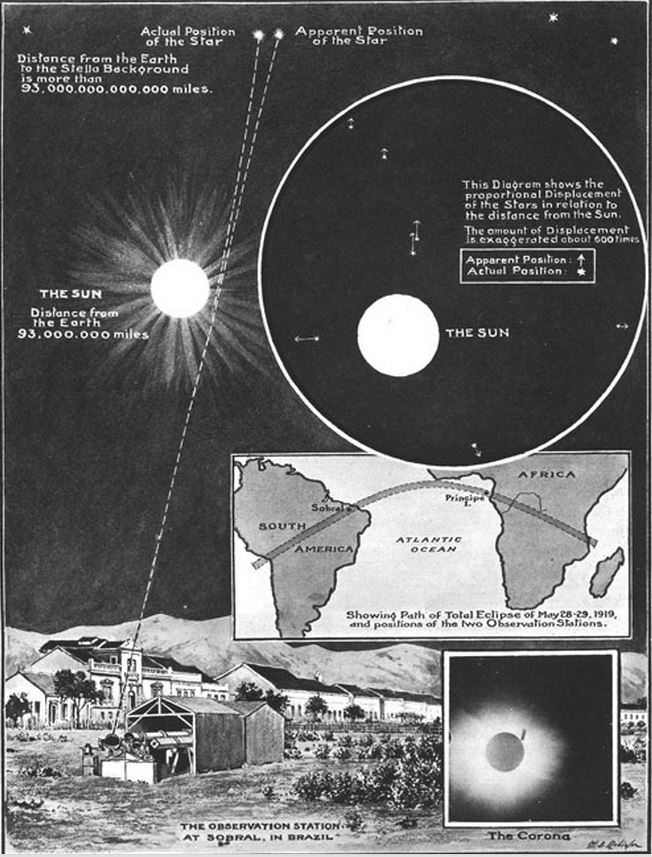 Σχηματική περιγραφή των μετρήσεων «καμπύλωσης του φωτός», από την αποστολή του Eddington, κατά τη διάρκεια της ηλιακής έκλειψης στις 29 Μαΐου του 1919. Η εικόνα αυτή δημοσιεύθηκε στις 22 Noεμβρίου 1919 στην εφημερίδα Illustrated London News.