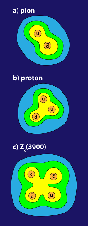 Αυτή τη φορά, οι επιστήμονες βρήκαν ενδείξεις για ένα νέο σωματίδιο με ενέργεια περίπου 3,9 γιγαηλεκτρονιοβόλτ (σχεδόν τετραπλάσια από το βάρος του πρωτονίου), το οποίο φαίνεται να έχει τέσσερα κουάρκ, ένα ζεύγος κουάρκ και ένα ζεύγος αντικουάρκ. Οι κατοπινές αναλύσεις ενισχύουν την πεποίθηση ότι το νέο σωματίδιο Zc(3900), που έχει ηλεκτρικό φορτίο, είναι μια άγνωστη έως τώρα μορφή ύλης.