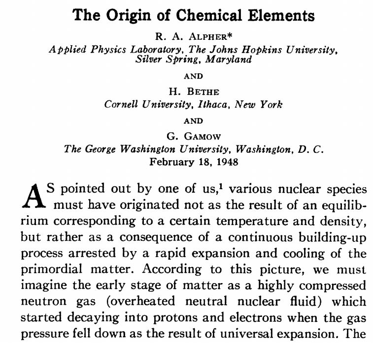 Την 1η Απριλίου του 1948, δημοσιεύθηκε στο Physical Review το κλασικό άρθρο με τίτλο «Η προέλευση των χημικών στοιχείων», όπου για πρώτη φορά γίνεται προσπάθεια περιγραφής των πρώτων λεπτών της Μεγάλης Έκρηξης