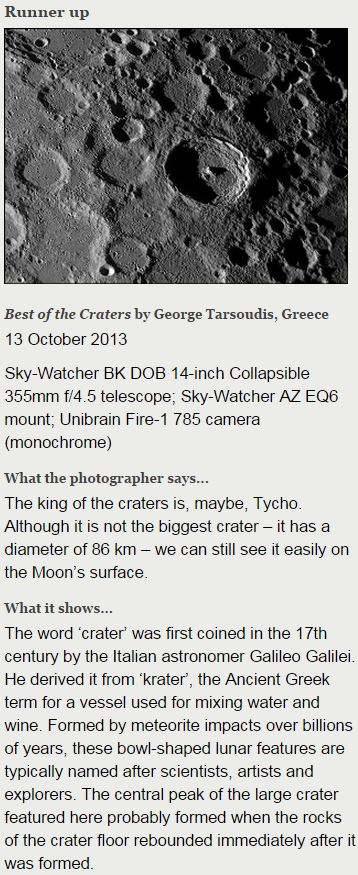 2ος στην κατηγορία του διεθνούς διαγωνισμού ΑΣΤΡΟΦΩΤΟΓΡΑΦΙΑΣ ASTRONOMY PHOTOGRAPHER OF THE YEAR 2014, που διοργανώνει το ROYAL MUSEUMS GREENWICH ήρθε ο Γιώργος Ταρσούδης, με την φωτογραφία του από την περιοχή του κρατήρα TYCHO