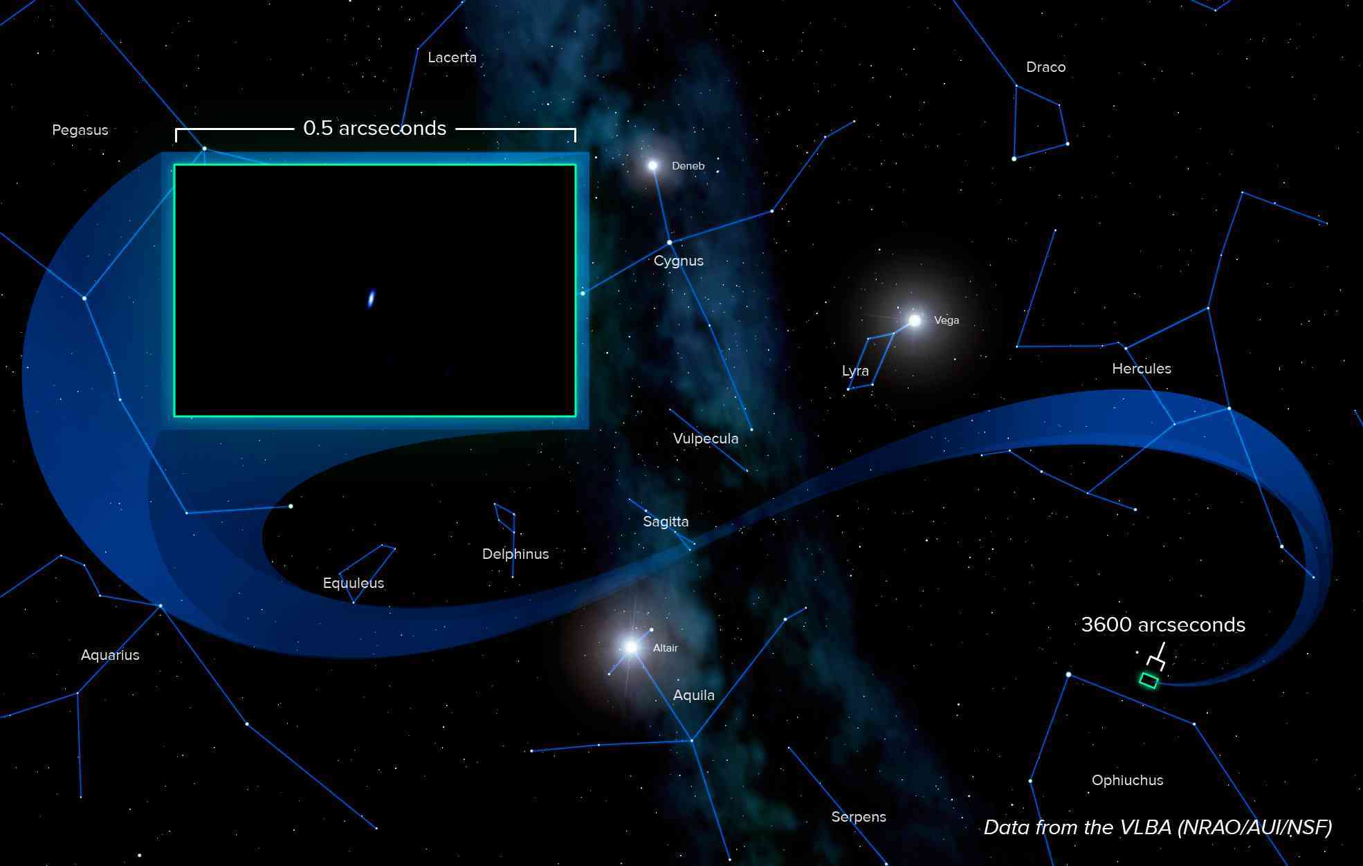 (κλικ πάνω στην εικόνα για μεγέθυνση) Η θέση του Voyager 1 στον ουρανό, όπως αυτό φαινόταν από το VLBA στις 21 Φεβρουαρίου 2013. Η πραγματική εικόνα είναι η κουκκίδα μέσα στο μεγεθυμένο τμήμα. Τότε το Voyager 1 απείχε 18,5 δισεκατομμύρια χιλιόμετρα από την Γη.