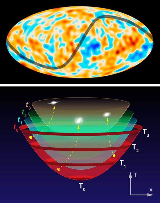 Η πάνω εικόνα δείχνει τον πλήρη χάρτη του ουρανού όπως τον είδε το Planck – οι αποκλίσεις στην κοσμική ακτινοβολία υποβάθρου σε μεγάλες κλίμακες είναι πιο έντονες στην δεξιά πλευρά του ουρανού. Η κάτω εικόνα απεικονίζει την εξέλιξη ενός ανοικτού σύμπαντος σύμφωνα με τους Liddle και Cortês (prl.aps.org)