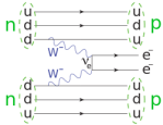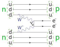 Διάγραμμα Feynman για την διπλή βήτα διάσπαση χωρίς εκπομπή νετρίνων, κατά την οποία δυο νετρόνια μετατρέπονται σε νετρόνια. Τα μόνα εκπεμπόμενα προϊόντα είναι δυο ηλεκτρόνια, τα οποία μπορούν να προκύψουν αν το νετρίνο και το αντινετρίνο είναι το ίδιο σωματίδιο (νετρίνο Majorana), έτσι ώστε το ίδιο νετρίνο να μπορεί να εκπεμφθεί και να απορροφηθεί από τον πυρήνα. Η ανίχνευση της διπλής βήτα διάσπασης θα επιβεβαιώσει το αν τα νετρίνα είναι σωματίδια Majorana.