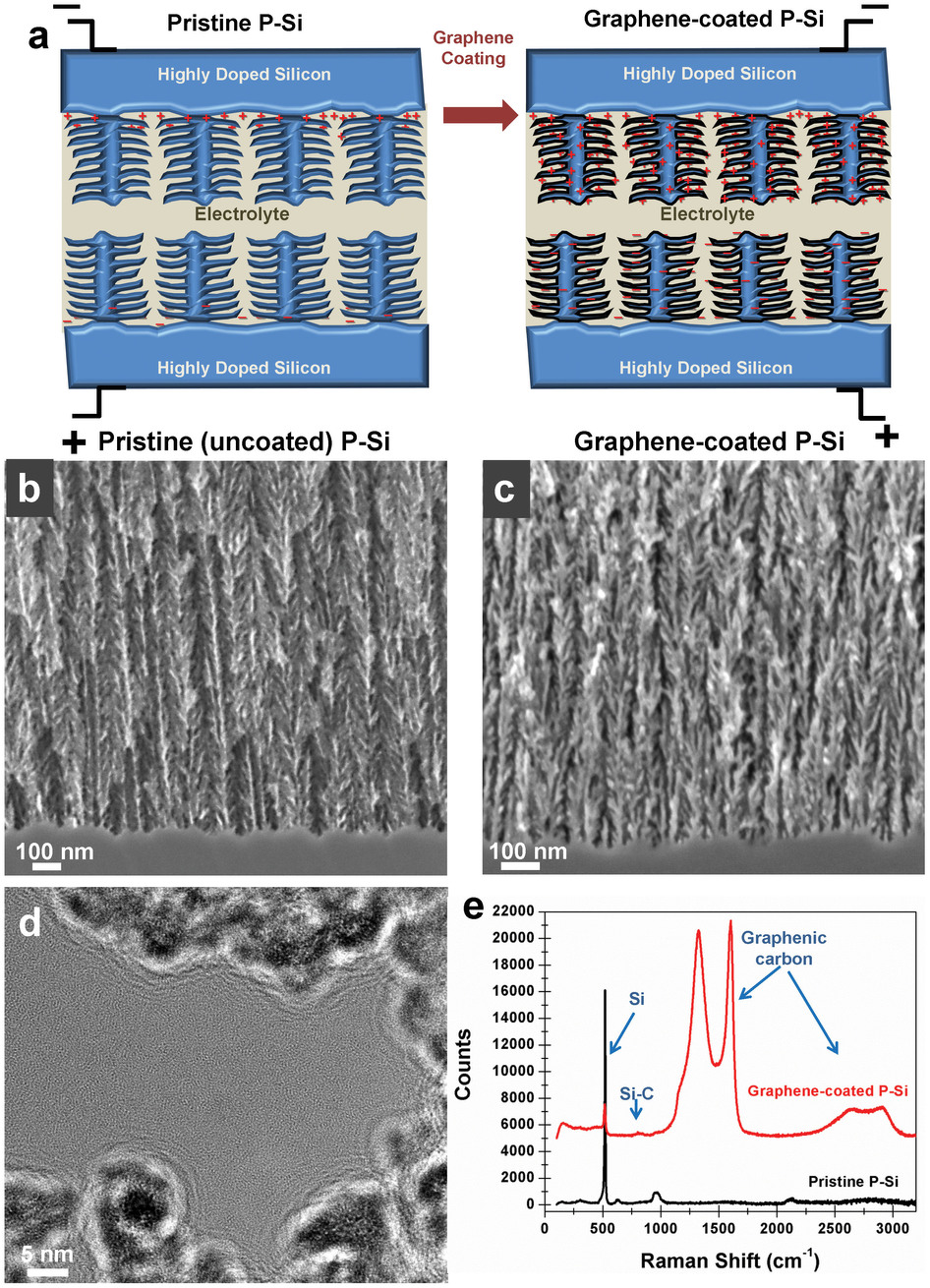 Η ομάδα του επίκουρου καθηγητή Κάρι Πιντ, που ήταν επικεφαλής του προγράμματος, κάλυψε το πυρίτιο με μερικά νανόμετρα γραφενίου, σταθεροποιώντας την επιφάνειά του και καθιστώντας την ιδανική για αποθήκευση ενέργειας. Το στρώμα γραφενίου λειτουργεί ως προστατευτική επικάλυψη, ενώ παράλληλα βελτιώνει τις επιδόσεις του υλικού όσον αφορά στην αποθήκευση ενέργειας.