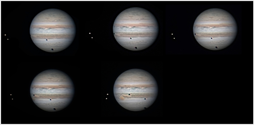 Ο πιο απομακρυσμένος δορυφόρος, στο αριστερό άκρο της εικόνας, είναι η Καλλιστώ. Πιο κοντά στον δίσκο του Δία είναι η Ιώ και λίγο πιο αριστερά η Ευρώπη. Η λίγο επιμήκης σκιά προς το νότιο πόλο ανήκει στην Καλλιστώ και η πάνω σκιά, δεξιά της Μεγάλης Ερυθράς Κηλίδας, ανήκει στην Ιώ.