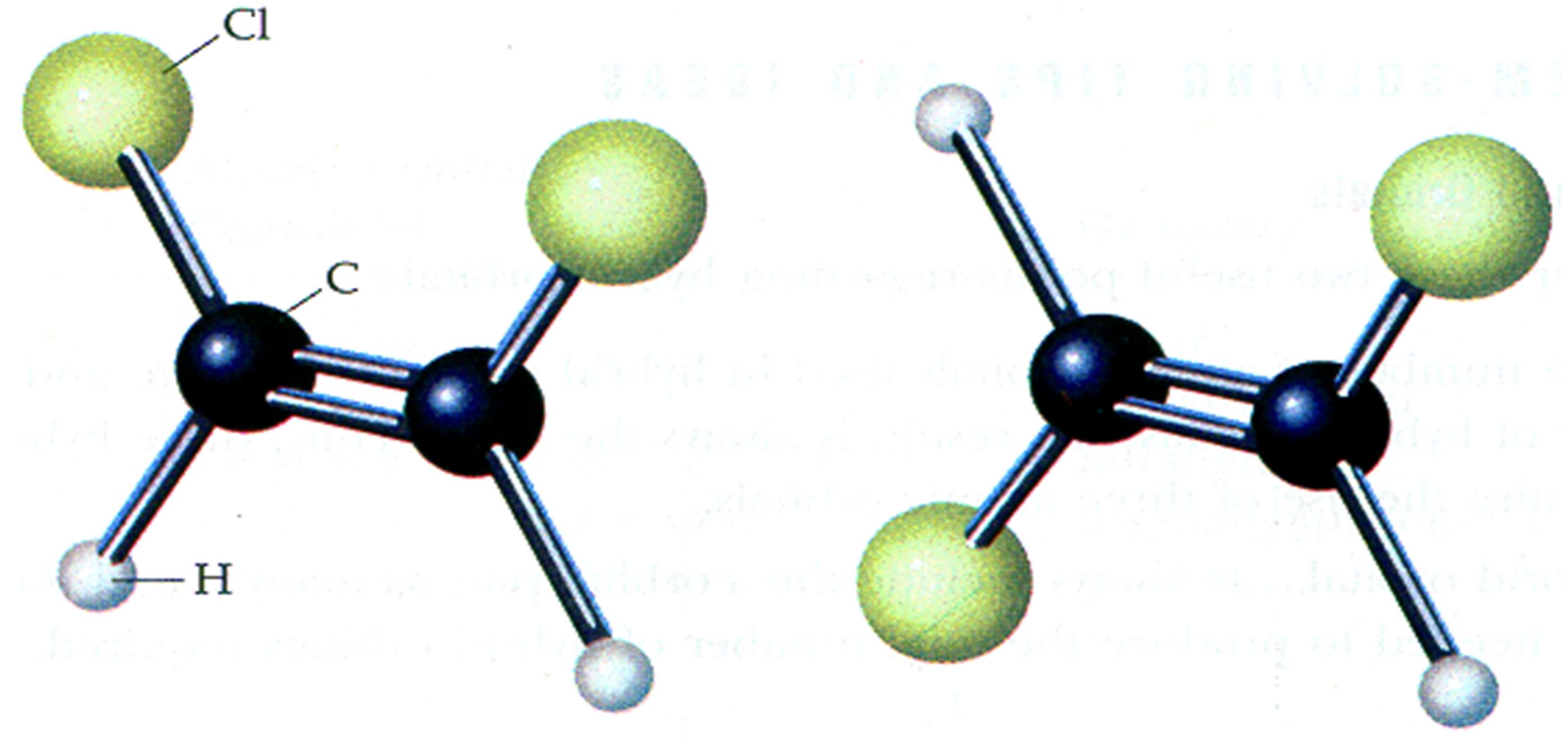 Ένα απλό παράδειγμα γεωμετρικών ισομερών cis και trans. Έχουν τον ίδιο μοριακό τύπο αλλά διαφορετική διάταξη των ατόμων στο χώρο. Εξαιτίας του διαφορετικού σχήματος τα ισομερή έχουν και διαφορετικές ιδιότητες.