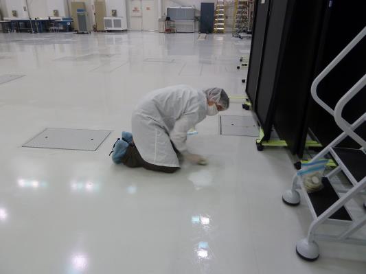 Mικροβιολόγος συλλέγει ένα δείγμα επιχρίσματος από το δάπεδο αποστειρωμένου χώρου στον οποίο συναρμολογούνται διαστημικά σκάφ,η στο Jet Propulsion Laboratory της NASA.