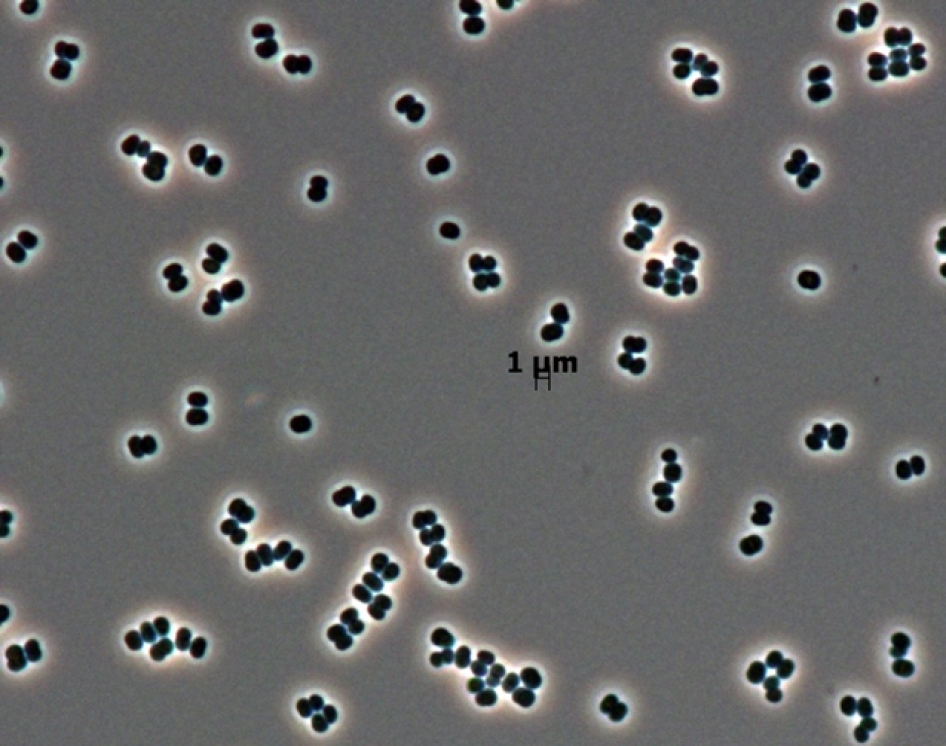 Εικόνα από μικροσκόπιο που δείχνει δεκάδες βακτήρια Tersicoccus phoenicis που βρέθηκαν μόνο σε εργαστήρια προετοιμασίας διαστημικών αποστολών. Από την κλίμακα του ενός μικρομέτρου (1 μm) που περιέχεται στην εικόνα βλέπουμε ότι τα βακτήρια είναι αυτής της τάξης μεγέθους.