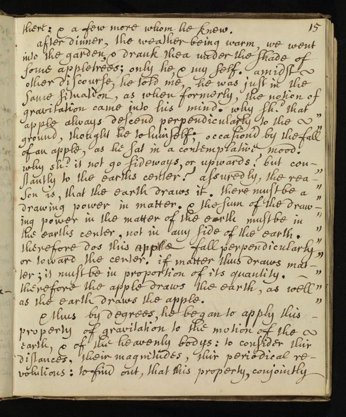Γράφει ο Stukeley στο χειρόγραφό του: «Μετά το δείπνο, αφού ο καιρός ήταν ζεστός πήγαμε στον κήπο και ήπιαμε τσάι κάτω από τη σκιά κάποιας μηλιάς. Μόνον εκείνος κι εγώ. Μεταξύ άλλων, μου είπε ότι ήταν περίπου στην ίδια κατάσταση, όπως όταν του ήρθε στο μυαλό η ιδέα της βαρύτητας.