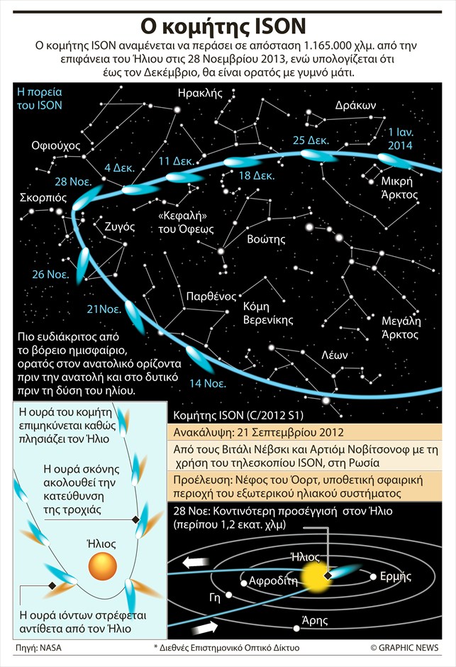 Αυτή τη στιγμή, ο παγωμένος κομήτης (που η κωδική ονομασία του είναι C/2012 S1 ISON) διασχίζει τον αστερισμό της Παρθένου. Σύμφωνα με το πρακτορείο Reuters και το Space.com, θα φθάσει στο κοντινότερο σημείο από τον καυτό Ήλιο στις 28 Νοεμβρίου, σε απόσταση περίπου 1,2 εκατ. χιλιομέτρων από αυτόν, και όλα τα τηλεσκόπια, διαστημικά και επίγεια, επαγγελματικά και ερασιτεχνικά, θα είναι στραμμένα πάνω του για να δουν αν θα επιβιώσει από τη στενή επαφή του με το άστρο μας, οπότε η θερμοκρασία του κομήτη αναμένεται να ανέβει στους 2.760 βαθμούς Κελσίου.