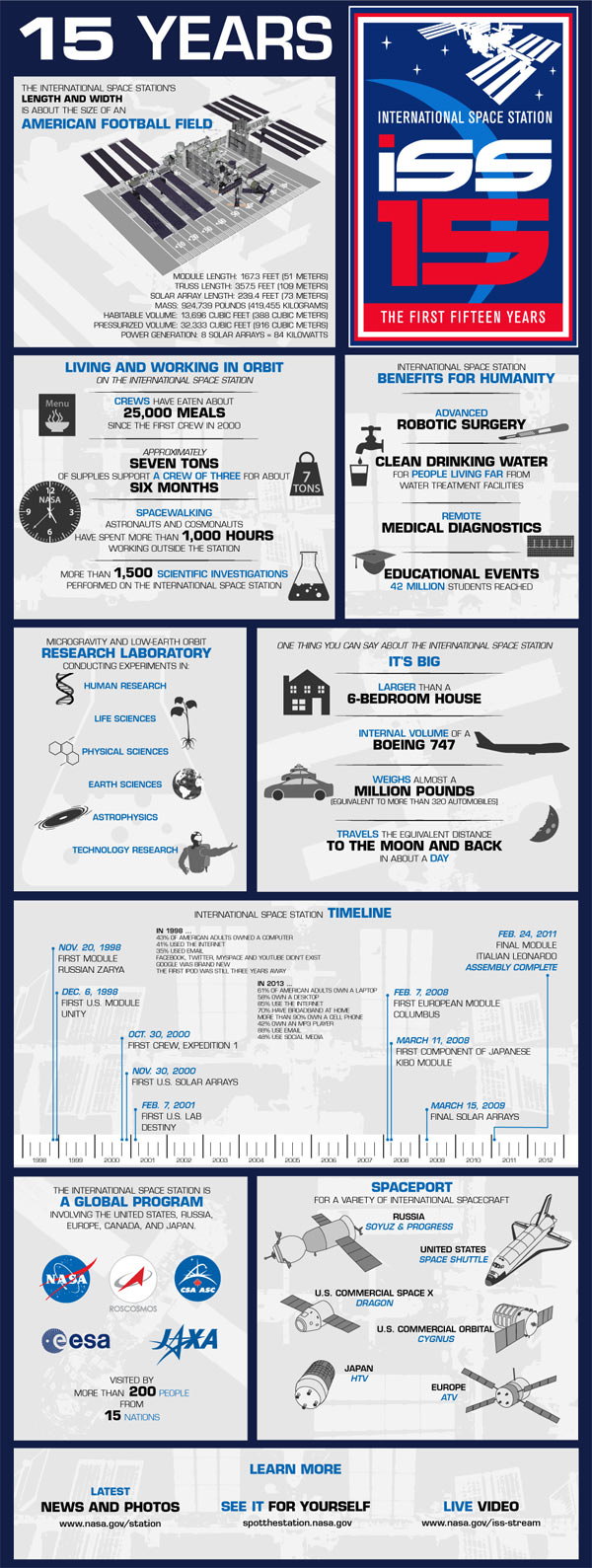 Τη συμπλήρωση των 15 χρόνων του, γιορτάζει σήμερα ο Διεθνής Διαστημικός Σταθμός, το μεγαλύτερο συνεταιριστικό έργο που έχει πραγματοποιηθεί ποτέ στον χώρο της επιστήμης, με τη συμμετοχή της αμερικανικής NASΑ, της ευρωπαϊκής ESA (που εξέδωσε σχετική ανακοίνωση), της ρωσικής Roskosmos, της Καναδικής Υπηρεσίας Διαστήματος και της Ιαπωνικής Αεροδιαστημικής Υπηρεσίας.