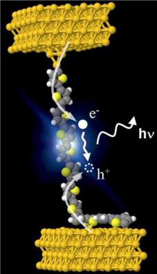 Oι ερευνητές διαπίστωσαν ότι το μόριο του πολυθειοφενίου είχε την συμπεριφορά μιας φωτοδιόδου (LED). Όταν ηλεκτρόνια κινούνταν από την ακίδα του μικροσκοπίου προς την επιφάνεια χρυσού το μακρομόριο εξέπεμπε φωτόνια. Με αντιστροφή της πολικότητας, η εκπομπή του φωτός γινόταν αμελητέα.