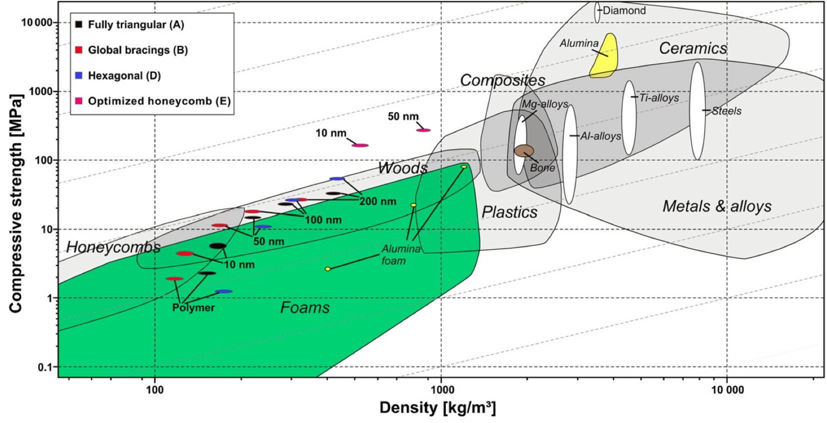 Οι επιστήμονες του Ινστιτούτου Τεχνολογίας της Καρλσρούης (ΚΙΤ), με επικεφαλής τον Γιενς Μπάουερ, που έκαναν τη σχετική δημοσίευση στο περιοδικό της Εθνικής Ακαδημίας Επιστημών των ΗΠΑ (PNAS), χρησιμοποίησαν τη νέα τεχνική της τρισδιάστατης λιθογραφίας λέιζερ για να δημιουργήσουν μικροδομές πολυμερούς, που μιμούνται το ελαφρύ βάρος (μικρή πυκνότητα) και ταυτόχρονα τη δύναμη και αντοχή υλικών όπως τα οστά και τα ξύλα. Ο σχετικός νανοτεχνολογικός εξοπλισμός έχει δημιουργηθεί από την εταιρεία Nanoscribe, που είναι θυγατρική («τεχνοβλαστός») του Ινστιτούτου ΚΙΤ.