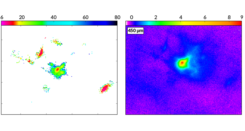 Καθώς τα μόρια σκόνης απορροφούν το φως από άλλα άστρα και θερμαίνονται, το επανακπέμπουν στη συνέχεια σε συχνότητες υπέρυθρης ακτινοβολίας. Οι επιστήμονες χρησιμοποίησαν τις δύο υπέρυθρες κάμερες στο τηλεσκόπιο James Clerk Maxwell στη Χαβάη, εντοπίζοντας πέντε μεγάλα και πυκνά νέφη αερίων, που στο κέντρο τους έχουν θερμοκρασία μόλις 8 με 20 βαθμών Κέλβιν. Οι περιοχές αυτές βρίσκονται συχνά δίπλα σε περιοχές στις οποίες δημιουργούνται αστέρια με ταχείς ρυθμούς.