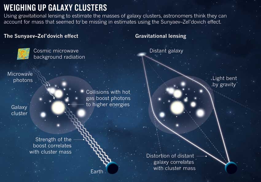 Η διαφορά στις εκτιμήσεις οφείλεται σε ένα φυσικό φαινόμενο που ονομάζεται Sunyaev–Zel’dovich. Σύμφωνα με αυτό, το Πλανκ συλλέγει φωτόνια που στην πορεία έχουν περάσει από γαλαξιακά σμήνη.