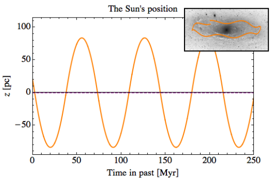 H απόσταση του ήλιου πάνω από το γαλαξιακό επίπεδο (σε παρσέκ) συναρτήσει του χρόνου (σε εκατομμύρια χρόνια). Στην ένθετη εικόνα βλέπουμε το πως κινείται ο ήλιος γύρω από το γαλαξιακό κέντρο, ενώ ταυτόχρονα ταλαντώνεται κάθετα. Η σκοτεινή ύλη ευθύνεται για την κίνηση αυτή μέσω της οποίας ερμηνεύεται το γεγονός της πτώσης μεγάλων μετεωριτών στη Γη σε τακτά χρονικά διαστήματα, περίπου κάθε 35 εκατομμύρια χρόνια.
