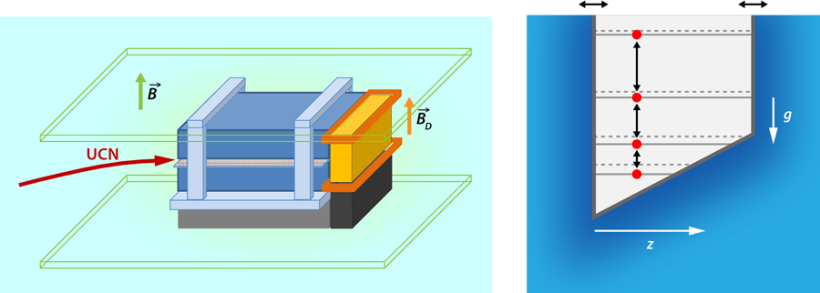 (Αριστερά) Η πειραματική διάταξη παγίδευσης νετρονίων. Υπερ-ψυχρά νετρόνια εισέρχονται στο χώρο μεταξύ δυο καθρεπτών που δρουν ως πηγάδι δυναμικού, εξαιτίας του οποίου το ενεργειακό φάσμα των νετρονίων γίνεται διακριτό. Ένας ανιχνευτής μετρά τα νετρόνια που εξέρχονται από την κοιλότητα των δυο καθρεπτών. Ο κάτω καθρέπτης έχει την δυνατότητα κατακόρυφης ταλάντωσης, γεγονός που δημιουργεί διεγέρσεις των νετρονίων.