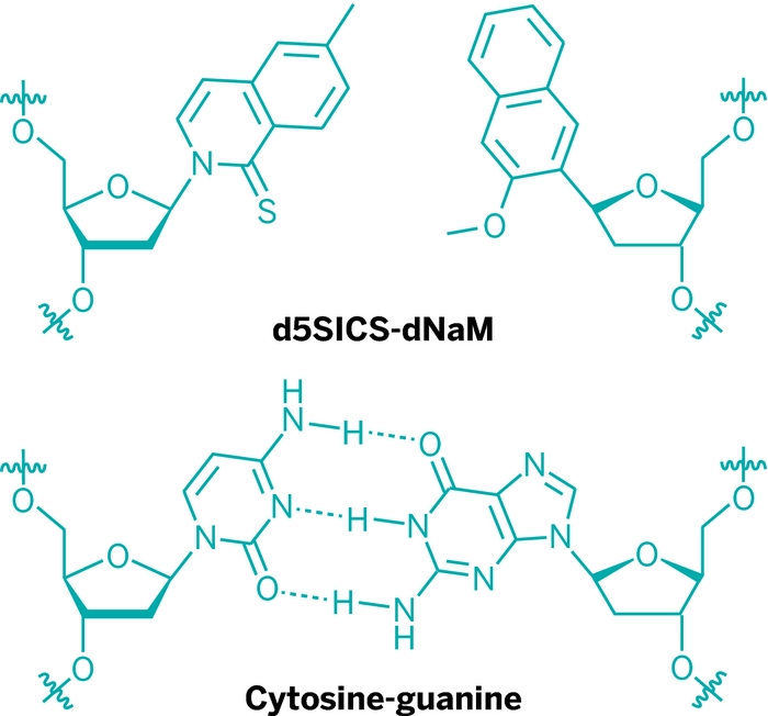 Η δομή των νέων συζυγών βάσεων Χ και Υ (d5SICS–dNaM) σε σύγκριση με τις φυσικές συζυγείς βάσεις γουανίνη και κυτοσίνη