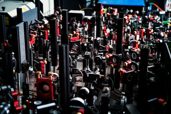 Ένα δάσος οπτικών στοιχείων που αποτελούν τμήμα της συσκευής κβαντικής τηλεμεταφοράς που χρησιμοποίησε η ομάδα των φυσικών στην Ολλανδία
