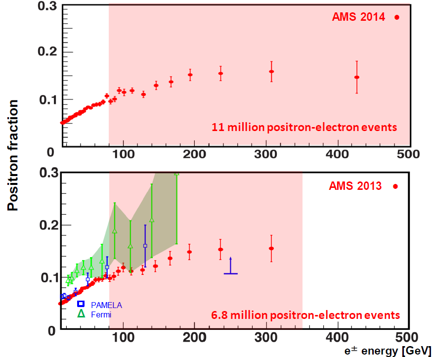 Πριν από έναν χρόνο η ομάδα του AMS ανέφερε αύξηση των ποζιτρονίων που ανιχνεύονται, η προέλευση των οποίων ίσως να οφείλεται σε συγκρούσεις σωματιδίων της σκοτεινής ύλης.