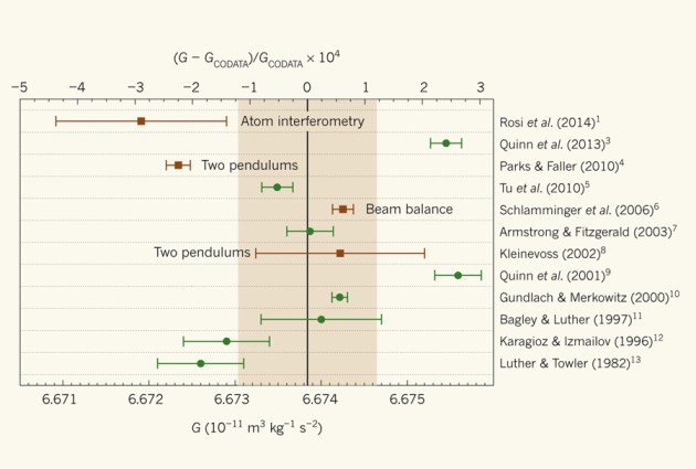 Η μέτρηση της σταθεράς G με ατομική συμβολομετρία (το πρώτο πειραματικό σημείο πάνω) σε σύγκριση με τις παλαιότερες μετρήσεις που χρησιμοποιούν διαφορετικές μεθόδους