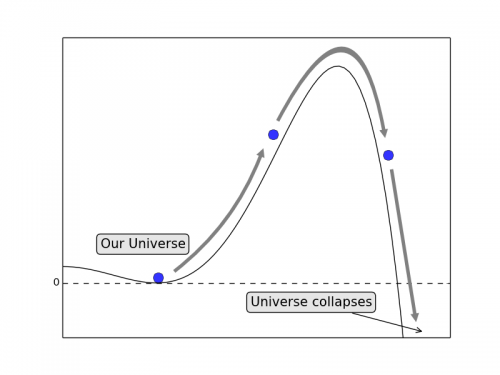 Το σύμπαν μας βρίσκεται σε μια «κοιλάδα» δυναμικού ενός πεδίου, που συνδέεται με την συμπεριφορά του μποζονίου Higgs. Υπάρχει επίσης μια βαθύτερη κοιλάδα, αλλά το σύμπαν μας εμποδίζεται στο εισέλθει σ’ αυτήν από τον ψηλότερο «λόφο». Κατά την περίοδο του αρχέγονου κοσμικού πληθωρισμού, σύμφωνα με τα αποτελέσματα του πειράματος BICEP2, το σύμπαν θα μπορούσε να αποκτήσει την κατάλληλη «ώθηση» ώστε να διαβεί στην επόμενη βαθύτερη κοιλάδα, που θα προκαλούσε την κατάρρευσή του σε λιγότερο από ένα δευτερόλεπτο.