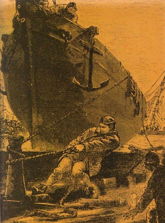 «…Το Τραμπάκολο γλιστρούσε γρήγορα προς τα κάτω. Ένα σύννεφο λευκού καπνού στροβιλιζόταν γύρω από την πλώρη καθώς τριβόταν με τα ξύλα της ράμπας ενώ η πρύμνη του ήδη είχε βουτήξει στα νερά του κόλπου.