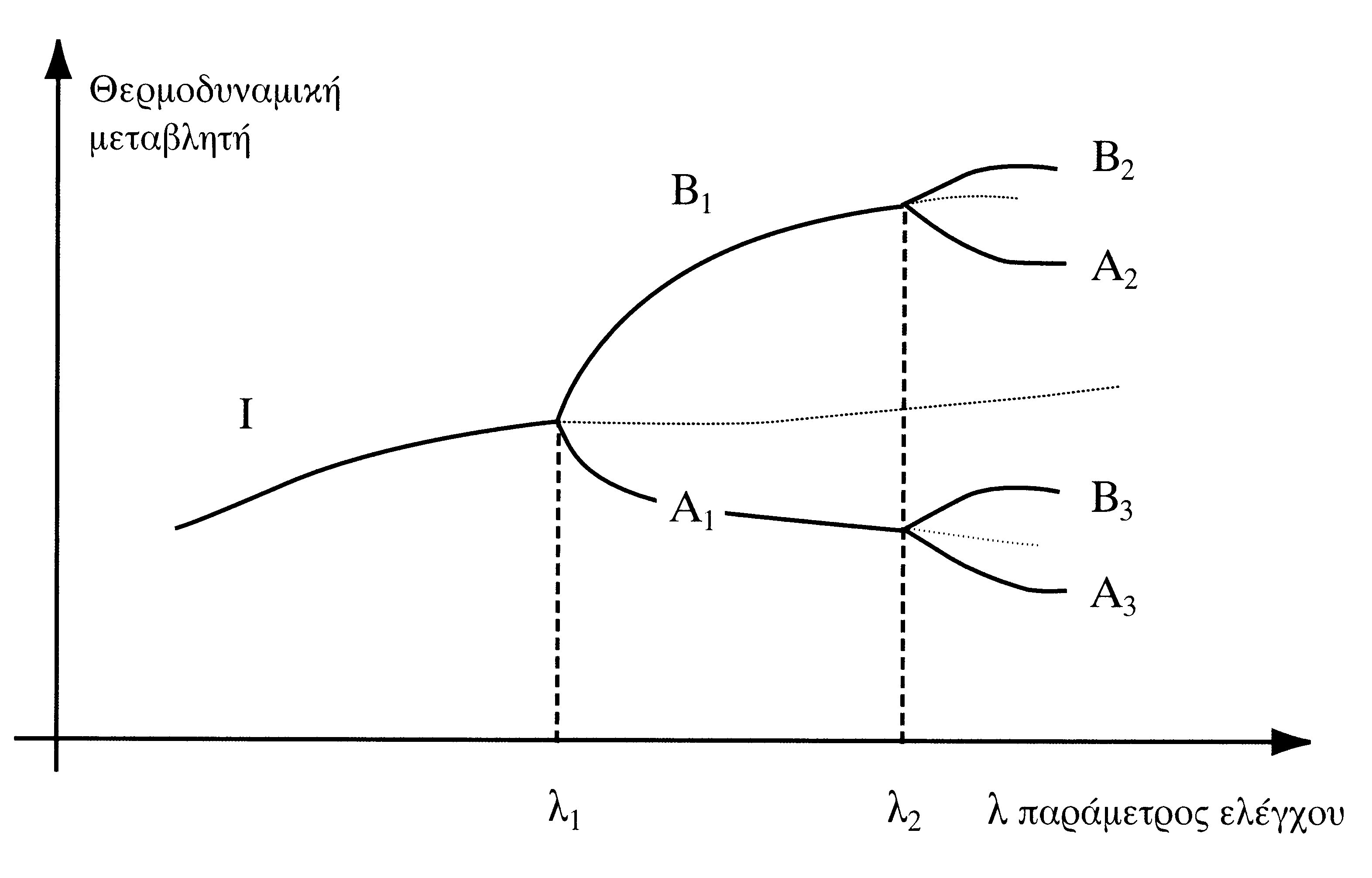 Εικόνα 2: Η Μη Αντιστρέψιμη Τάξη μέσω Διακυμάνσεων. Η επιλογή των διαδρομών Αi, Βi στα κρίσιμα σημεία λi, i=1, 2, … δεν είναι αιτιοκρατική, αλλά εξαρτάται από τις διακυμάνσεις. Οι διαφορετικές δυνατές διαδρομές όπως Ι, Β1, A2, … και η Ι, Α1, Β3, … επιλέγονται πιθανοκρατικά με μη αντιστρέψιμο τρόπο.