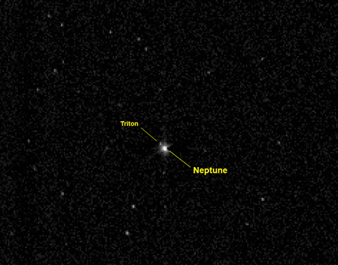Ο γίγαντας πλανήτης Ποσειδώνας και ο ο δορυφόρος του Τρίτων, όπως τους «είδε» η κάμερα του διαστημικού σκάφους New Horizons, στις 10 Ιουλίου 2014, από μια απόσταση περίπου 3.96 δισεκατομμύρια χιλιόμετρα – πάνω από 26 φορές η απόσταση Γης – Ήλιου