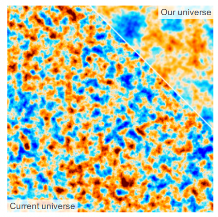 Ακόμη και στην πρώτη «φωτογραφία» του Σύμπαντος, στον απόηχο της Μεγάλης Έκρηξης θα βρει κανείς ενδείξεις για την ύπαρξη της σκοτεινής ύλης. Κατά τις πρώτες στιγμές του Σύμπαντος, δύο αντίρροπες δυνάμεις μονομαχούσαν: από τη μία η πίεση των φωτονίων που ωθούσε το Σύμπαν στη διαστολή και από την άλλη η δύναμη της βαρύτητας που το συμπίεζε. Ο ανταγωνισμός αυτός προκάλεσε μία ταλάντωση των φωτονίων και της μάζας μεταξύ πυκνών και αραιών περιοχών. Η ύπαρξη της σκοτεινής ύλης άφησε ένα πολύ χαρακτηριστικό ίχνος στην ακτινοβολία υποβάθρου και συνεισέφερε στη βαρυτική κατάρρευση ορισμένων περιοχών, καθώς δεν επηρεαζόταν από την πίεση των φωτονίων.