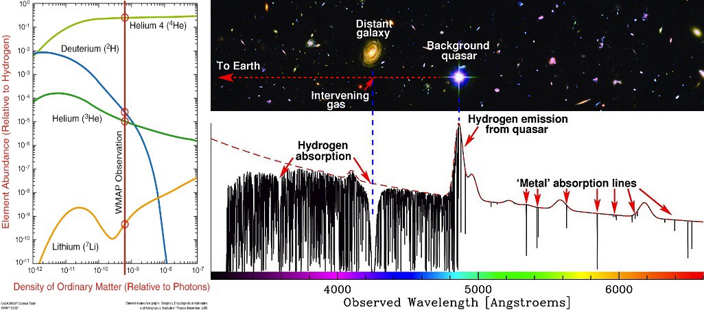 Οι θεωρητικοί υπολογισμοί της σύνθεσης των πυρήνων που πραγματοποιήθηκε στα πρώτα λεπτά αμέσως μετά την Μεγάλη Έκρηξη, εξηγούν μεν τις περιεκτικότητες των ελαφρών πυρήνων όπως το Ήλιο που περιέχονται στο σύμπαν,