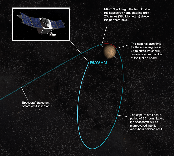 Η ιστοσελίδα της η NASA ανακοίνωσε ότι: Μετά από δέκα μήνες ταξιδιού όπου διήνυσε μια απόσταση 711 εκατομμυρίων χιλιομέτρων το MAVEN (Mars Atmosphere and Volatile EvolutioN) μπήκε σε τροχιά γύρω από τον Άρη, αργά την Κυριακή.