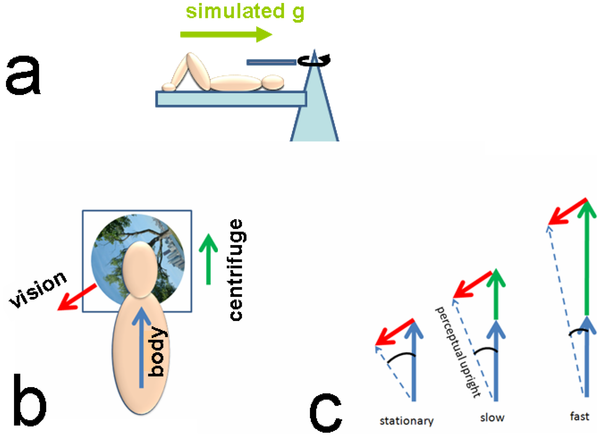 Ο Laurence Harris και οι συνεργάτες του στο Πανεπιστημίου York του Toronto, ισχυρίζονται ότι η έλλειψη βαρύτητας ή η μειωμένη βαρύτητα κάνει τους ανθρώπους να χάνουν την αίσθηση του «πάνω» και του «κάτω». Πραγματοποίησαν πειράματα βάζοντας εθελοντές σε έναν τεράστιο περιστρεφόμενο βραχίονα, στο εσωτερικό του οποίου «επικρατούσαν» βαρυτικά πεδία διαφορετικής ισχύος. Καθώς οι εθελοντές αισθανόντουσαν μικρότερη βαρύτητα έβλεπαν τις εικόνες ενός τοπίου ή το γράμμα «p», το οποίο διάβαζαν ως «p» ή ως «d» ανάλογα με το αν νόμιζαν ότι βρίσκονται «πάνω» ή «κάτω».