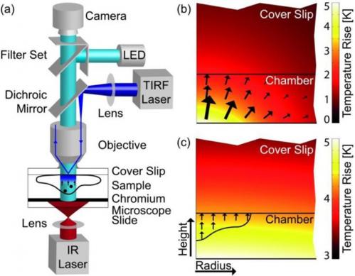 Η πειραματική διάταξη της τεχνικής. Το κύτταρο θερμαίνεται με ένα λέιζερ υπερύθρων και τα μόρια κινούνται κατά μήκος της μεταβολής της θερμοκρασίας, που υποδεικνύουν τα βέλη.