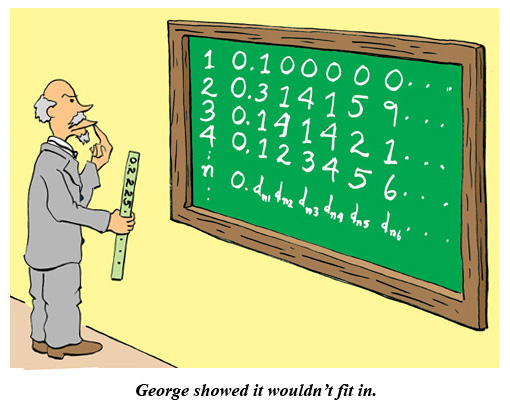 Αυτός ο αριθμός δεν μπορεί να ανήκει στον αρχικό κατάλογο αφού διαφέρει από τον πρώτο αριθμό στο πρώτο δεκαδικό ψηφίο, από τον δεύτερο στο δεύτερο δεκαδικό ψηφίο, από τον τρίτο στο τρίτο δεκαδικό ψηφίο κ.ο.κ.