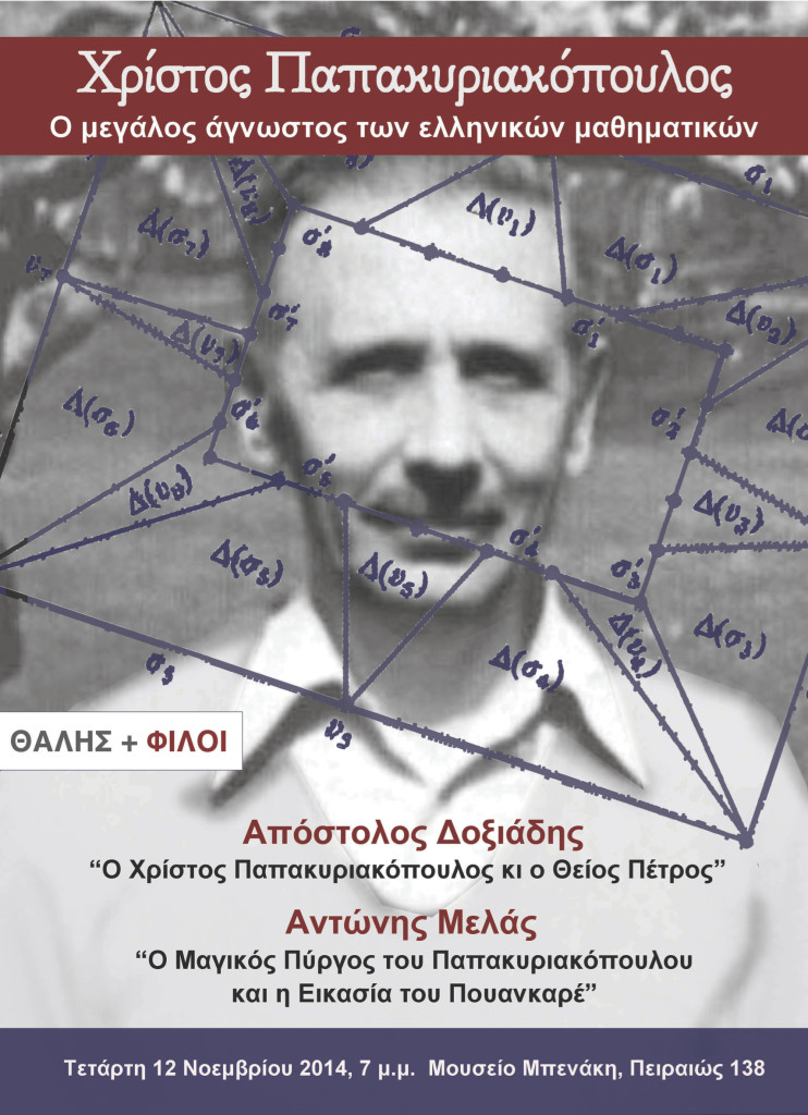 Στην ομιλία του «Ο Χρίστος Παπακυριακόπουλος και ο Θείος Πέτρος», ο συγγραφέας Απόστολος Δοξιάδης θα μιλήσει για τη ζωή του Παπακυριακόπουλου, καθώς και για τη ρομαντική, και εν τέλει ανεπιτυχή του προσπάθεια, στα τελευταία χρόνια της ζωής του, να λύσει το μεγάλο άλυτο πρόβλημα της τοπολογίας, την Εικασία του Πουανκαρέ. Με αφορμή τη σύντομη γνωριμία του με τον Παπακυριακόπουλο, το 1971-2, ο Απόστολος Δοξιάδης θα αναφερθεί επίσης στον τρόπο με τον οποίο η μορφή του αποτέλεσε την πρώτη έμπνευση για τον ήρωα του μυθιστορήματός του Ο Θείος Πέτρος και η Εικασία του Γκόλντμπαχ.