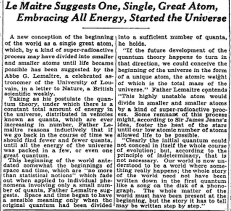 Έτσι, στις 19 Μαίου 1931, τέσσερα χρόνια μετά την διατύπωση της θεωρίας από τον Lemaître, οι New York Times αναφέρθηκαν σ’ αυτή τη νέα αυτή ιδέα, στην 3η σελίδα τους, όπως βλέπουμε στο παρακάτω απόκομμα: