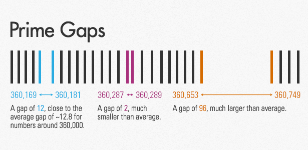 Στην περιοχή ενός αριθμού π.χ. του 360000, εμφανίζονται διαστήματα διαφόρων μηκών χωρίς κανέναν πρώτο αριθμό. Στην εικόνα βλέπουμε μερικά από αυτά τα διαστήματα, που ονομάζονται κενά μεταξύ των πρώτων αριθμών: το πρώτο κενό έχει μήκος κοντά στον μέσο όρο των κενών που εμφανίζονται στην περιοχή γύρω από τον 360000, το δεύτερο έχει την μικρότερη δυνατή απόσταση μεταξύ δυο πρώτων και το τρίτο έχει μήκος 96, πολύ μακριά από τον μέσο όρο.