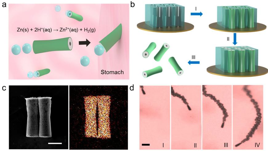 Οι μικρομηχανές της έρευνας είναι ουσιαστικά κύλινδροι από πολυμερές, μήκους 20 μικρομέτρων, καλυμμένοι με νανοσωματίδια ψευδαργύρου. Ο ψευδάργυρος αντιδρά με τα πεπτικά οξέα και απελευθερώνει φυσαλίδες υδρογόνου, οι οποίες βγαίνουν από το ένα άκρο και ωθούν τον κύλινδρο προς την αντίθετη κατεύθυνση. Η μικρομηχανή μπαίνει έτσι μέσα στο επιθήλιο που επενδύει το στομάχι, διαλύεται από τα οξέα και απελευθερώνει το περιεχόμενό της.