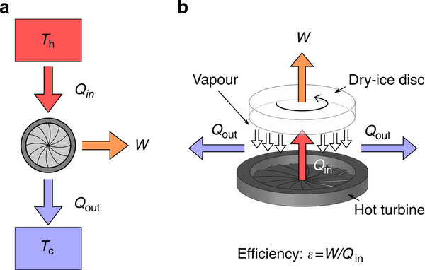 (a) Μια θερμική μηχανή λειτουργεί μεταξύ δυο δεξαμενών θερμότητας σε θερμοκρασίες Th και Tc, όπου Th>Tc. Η μηχανή μετατρέπει μέρος της απορροφούμενης θερμότητας Qin, σε έργο W και αποβάλλει στο περιβάλλον θερμότητας Qout (b) Μια μηχανή Leidenfrost χρησιμοποιεί μια θερμή τουρμπίνα της οποίας η θερμοκρασία Th, είναι μεγαλύτερη από το σημείο Leidenfrost ενός δίσκου ξηρού πάγου. Εξαιτίας της διαφοράς πίεσης ο δίσκος αιωρείται και ο ατμός που απελευθερώνεται προκαλεί την περιστροφή του δίσκου και την παραγωγή μηχανικού έργου.