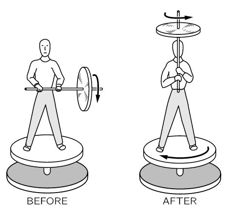 [σχήμα 1] Πριν: Ο άξονας περιστροφής του τροχού είναι οριζόντιος και η στροφορμή ως προς τον κατακόρυφο άξονα ισούται με μηδέν. Μετά: Ο άξονας περιστροφής του τροχού γίνεται κατακόρυφος. Η στροφορμή ως προς τον κατακόρυφο άξονα εξακολουθεί να είναι μηδέν, διότι ο άνθρωπος μαζί με τη βάση περιστρέφονται αντίθετα από τη φορά περιστροφής του τροχού.