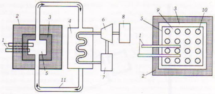 Διάγραμμα πυρηνικού αντιδραστήρα με γραφίτη ως επιβραδυντή: (1) ράβδοι ελέγχου (2) θωράκιση (3)ανακλαστήρας (4) εναλλάκτης θερμότητας (5) ενεργός ζώνη (6) ατμοστρόβιλος (7) συμπυκνωτής (8) γεννήτρια (9) επιβραδυντής (10 καύσιμο (11) ψυκτικό μέσο