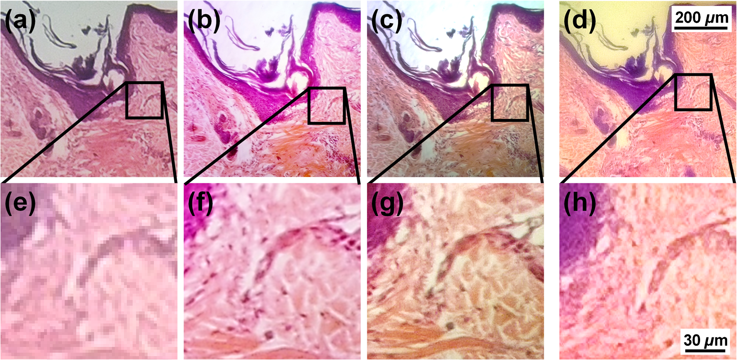 Σε μια επίδειξη των δυνατοτήτων του ελαστικού φακού, οι ερευνητές παρουσιάζουν φωτογραφίες μιας ιστολογικής πλάκας με ανθρώπινα τριχοθυλάκια, οι οποίες είναι συγκρίσιμες με τις εικόνες που έδωσε ένα επαγγελματικό μικροσκόπιο Olympus IX-70 με μεγέθυνση 100Χ.