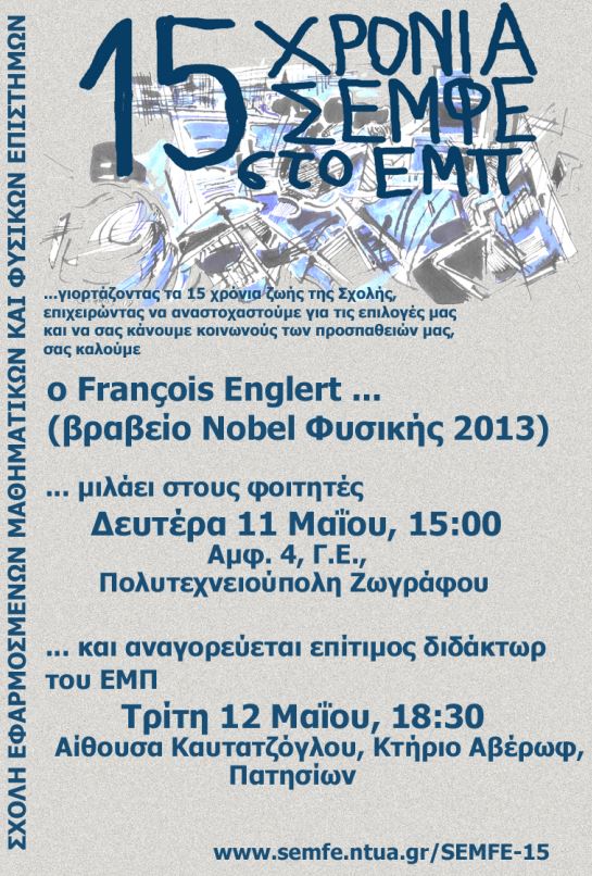 Δευτέρα 11 Μαΐου, 15:00, Αμφ. 4 Γ.Ε.: Ομιλία προς τους φοιτητές της ΣΕΜΦΕ του François Englert, Ομότιμου Καθηγητή στο Ελεύθερο Πανεπιστήμιο των Βρυξελών, Βραβείο Nobel Φυσικής 2013 (από κοινού με τον Peter Higgs), για «… την θεωρητική ανακάλυψη του μηχανισμού που συνεισφέρει στην κατανόησή μας για την προέλευση της μάζας των υποατομικών σωματιδίων και ο οποίος πρόσφατα επιβεβαιώθηκε μέσω της ανακάλυψης του προβλεπόμενου θεμελιώδους σωματιδίου από τα πειράματα ATLAS και CMS στον Μεγάλο Επιταχυντή Αδρονίων του CERN», όπως αναφέρει η αιτιολόγηση του βραβείου από την Βασιλική Σουηδική Ακαδημία Επιστημών.
