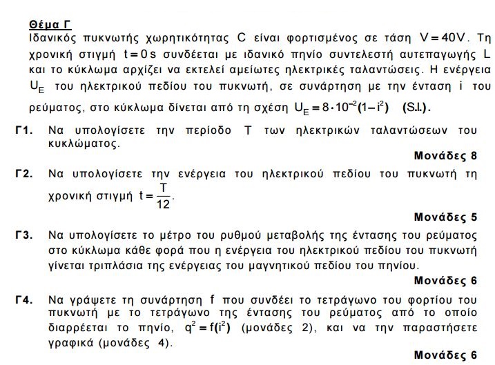 Γ1. Θέτοντας i=0 στην εξίσωση UE=8·10−2(1-i2), η ενέργεια του πυκνωτή γίνεται μέγιστη, οπότε: Εολ=8·10−2J=CV2/2 →C=10−4F