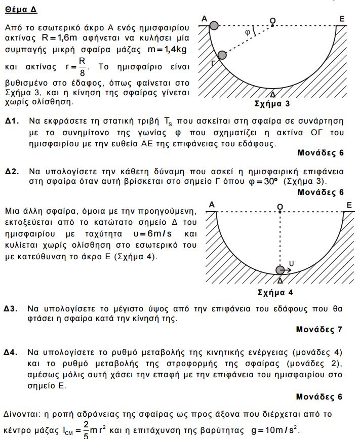 ΔΚ/Δt = −mgυΕ = −56 J/s και ρυθμός μεταβολής της στροφορμής της σφαίρας (ως προς το κέντρο μάζας της) ΔL/Δt = 0
