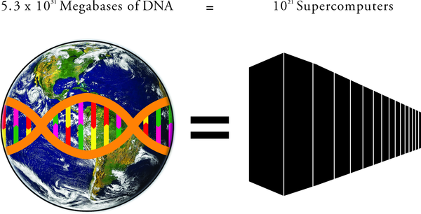 Το βάρος όλων των μορίων DNA όλων των ζωντανών οργανισμών της Γης φθάνει τα 50 δισεκατομμύρια τόνους γεμίζοντας ένα δισεκατομμύριο κοντέινερ πλοίων, ενώ η συνολική ικανότητα αποθήκευσης που έχει όλο αυτό το συσσωρευμένο γενετικό υλικό, ξεπερνά τις δυνατότητες ενός δισεκατομμυρίου τρισεκατομμυρίων υπερ-υπολογιστών.